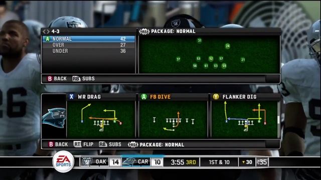 Entire 3rd quarter in Madden NFL 10 featuring the Oakland Raiders (controlled by designer Donny Moore) vs. the Carolina Panthers (controlled by designer Ian Cummings) - 7 minute quarters + accelerated clock - All-Pro difficulty for both players - Default slider settings - Features new pass rush tuning **DISCLAIMER** Alpha build - this is a work in progress game.