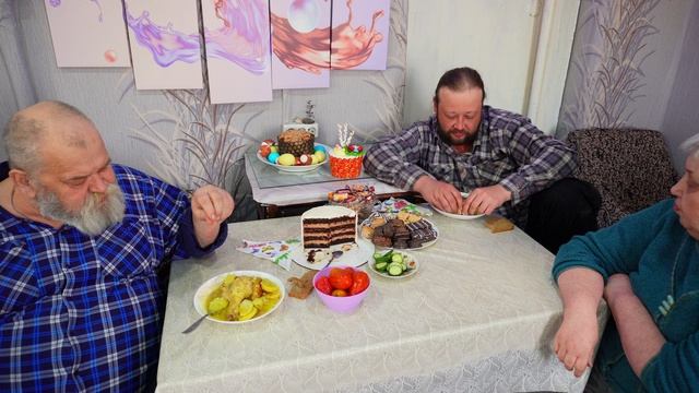 Как мы семьёй дружно едим курицу с картошкой и сладостями.
