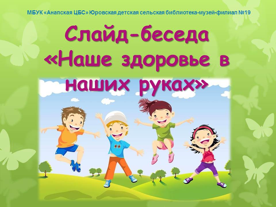Каждый ребенок должен знать, что здоровый образ жизни это самое надежное средство сохранения и укрепления здоровья. Здоровье – ни с чем несравнимая ценность. Каждому человеку присуще желание быть сильным и здоровым. Как же укрепить свое здоровье? Ответ прост - вести здоровый образ жизни. И в этом вам поможет слайд-беседа «Наше здоровье в наших руках». Главный библиотекарь Юровской детской сельской библиотеки-музея-филиала №19 И.А. Матюшова