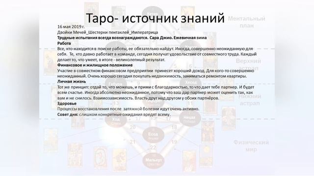 16 мая 2019 г. Двойки Мечей_Шестерки пентаклей_Императрица Трудные испытания всегда вознаграждаются. Сара Джио. Ежевичная зима Работа Все, кто находится в поиске работы, ее обязательно найдут. Иногда, совершенно неожиданную для себя. Те, кто давно работает в команде, сегодня получат удовольствие от совместного труда. Каждый делает то, что умеет, в итоге - великолепный результат. Финансовое и жилищное положение Участие в совместном финансовом предприятии принесет хороший доход. Для кого-то совершенно неожиданный. Очень хорошо сегодня покупать недвижимость, заниматься ремонтом квартиры. Личная жизнь Тот же принцип: отдай то, что можешь, и прими с благодарностью, то что дает тебе партнер. И будет всем счастье. Иногда абсолютно неожиданное, потому что ваш дар партнер может оценить так, как вам и не снилось. Взаимозависимость. Власть друг над другом у обоих партнёров. Здоровье Процессы восстановления после затяжной болезни идут очень активно. Совет дня: слишком конкретные ожидания вредят всему 16 мая 2019 г. Манназ перевернутая_Тейваз_Райдо перевернутая Преграды в личных отношениях легко устраняются снижением требований к партнеру. Нельзя от человека требовать того, что он дать не может. А вот риск потерять его велик. Стоит Посмотреть на того, кто рядом с вами другими глазами, и многое изменится. Всех благ!!!