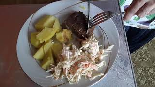 Тушеное мясо с печеной картошкой и зимним салатом. Семейный рецепт быстрого обеда