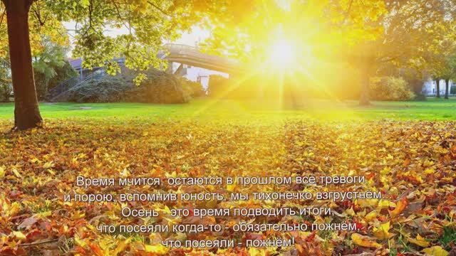 1. Осень, снова осень, птицы к югу улетают, теплых летних дней обратно не вернёшь... Осень, снова осень нам с тобой напоминает, что придет однажды время, что посеял-то пожнёшь, что посеял - то пожнёшь! 2. Время мчится,_остаются в прошлом все тревоги, и_порою,вспомнив юность,мы тихонечко взгрустнём... Осень - это время подводить итоги, что посеяли когда-то - обязательно пожнём, что посеяли - пожнём! 3. Осень жизни_и к тебе, мой друг, придет однажды, вечность пред тобою двери распахнёт! А_сегодня время есть,чтоб выбор сделать самый важный... Каждый сеет, что желает, но что сеет-то пожнёт, что посеет - то пожнёт! Шинкарева Светлана