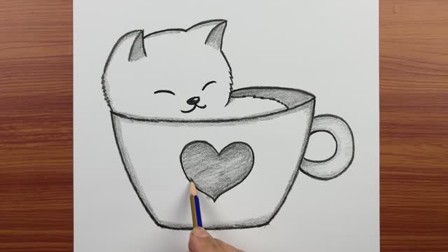 Как легко нарисовать кошку – Рисунок спящей кошки в кружке – Лёгкие рисунки карандашом
