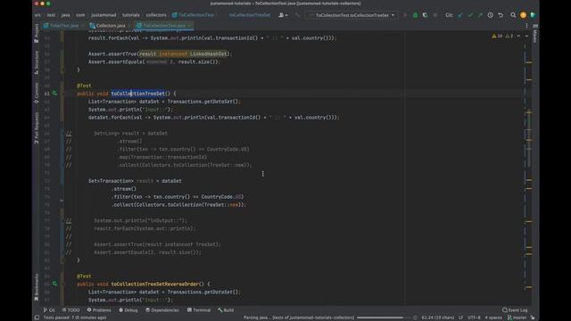 Collect data into LinkedHashSet, TreeSet and PriorityQueue. GitHub: https://github.com/savanibharat/justamonad-tutorials/blob/master/justamonad-tutorials-collectors/src/test/java/com/justamonad/tutorials/collectors/ToListTest.java Reference: https://justamonad.com/collectors-tolist-toset-tomap-tounmodifiablemap-toconcurrentmap-tocollection-with-25-examples/