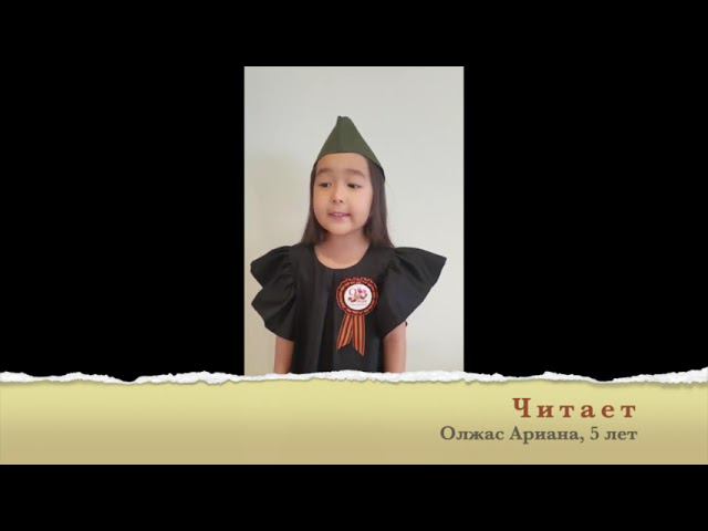 Олжаз Ариана, 5 лет, Детский сад «Берёзка», город Алматы, руководитель Сосновская Ирина Анатольевна, 2020 год Валерий Лужецкий «Алия» Как много уже лет прошло с тех пор, Когда девчонкой юной, очень смелой. Ты бросив на врага свой гневный взор, Вдруг поднялась в атаку тогда первой. Ты крикнула –“За родину - Ура” И за тобою поднялись все роты. Ты хрупкою девчонкою была, Но смело ты пошла на пулеметы. Закрыла телом ты тогда страну, Своей душой отчизну обняла. Совсем девчонкой в страшную войну, Ты навсегда в бессмертие ушла. Ты прожила всего лишь восемнадцать лет! Но подвиг твой века переживет. В душе ты каждого оставила свой след, И с именем твоим страна живет. Твой подвиг будем помнить Алия! Ты символ мужества и символ славы. Тобой гордится Казахстанская земля, И в честь тебя назвали улицы, бульвары.