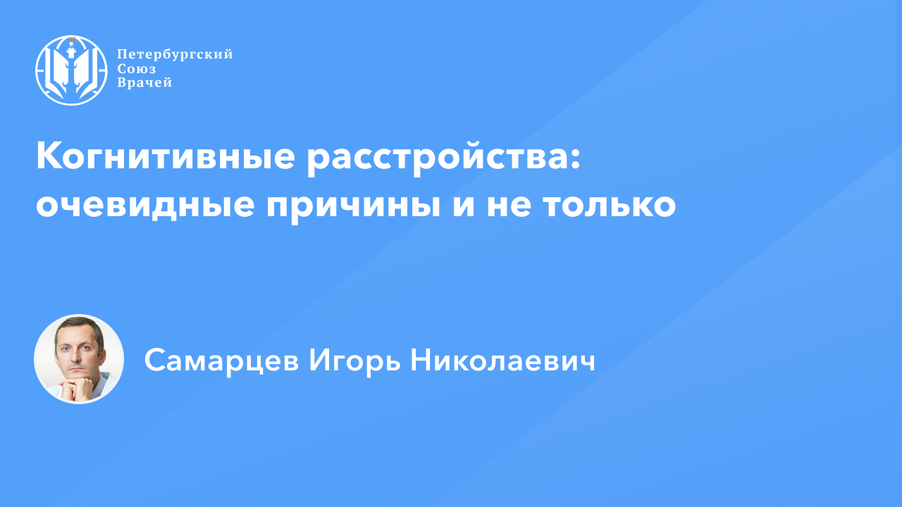 Когнитивные расстройства: очевидные причины и не только Сайт: www.spb.doctor Дата проведения: 30.11.2023, 20:00 Страница мероприятия: https://spb.doctor/i/23113020/ Программа: 1. 00:00:03 Когнитивные расстройства: очевидные причины и не только. Самарцев Игорь Николаевич 2. 01:08:44 Актуальные стратегии терапии когнитивных и аффективных нарушений у пациентов с ХИМ. Самарцев Игорь Николаевич 3. 01:46:46 Ответы на вопросы О семинаре: Когнитивные расстройства являются одними из самых распространенных видов неврологических нарушений, которые встречаются как в практике неврологов, так и врачей других специальностей. Поскольку когнитивные расстройства имеют симптоматику схожую с другими неврологическими нарушениями, будучи объединенными общим патоморфологическим и патофизиологическим субстратом, их диагностика представляет ряд сложностей. В онлайн-семинаре будут освещены современные подходы к диагностике и лечению когнитивных расстройств.