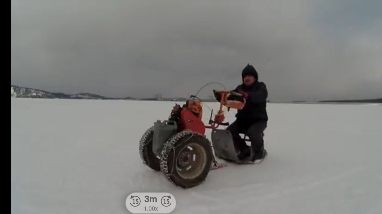Юрий Лесков. Решил испробовать в роли мотобуксировщика мотокультиватор из бензопилы Урал. Взял волокушу из оцинковки, на которой я отвожу снег от гаража и обычный стул и получился мотобуксировщик. Смотрите.