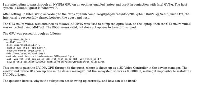 Ensuring correct subsystem of passed through GPU? (Optimus laptop and Intel GVT-g) Helpful? Please support me on Patreon: https://www.patreon.com/roelvandepaar With thanks & praise to God, and with thanks to the many people who have made this project possible! | Content (except music & images) licensed under CC BY-SA https://meta.stackexchange.com/help/licensing | Music: https://www.bensound.com/licensing | Images: https://stocksnap.io/license & others | With thanks to user Yuusou (superuser.com/users/574741), user Toby Speight (superuser.com/users/443006), user Mikaello (superuser.com/users/670364), and the Stack Exchange Network (superuser.com/questions/1152074). Trademarks are property of their respective owners. Disclaimer: All information is provided "AS IS" without warranty of any kind. You are responsible for your own actions. Please contact me if anything is amiss at Roel D.OT VandePaar A.T gmail.com
