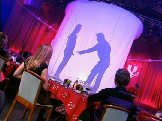 Харламов и Батрутдинов стоят за ширмой и обсуждают, что им показывать на своём бенефисе.