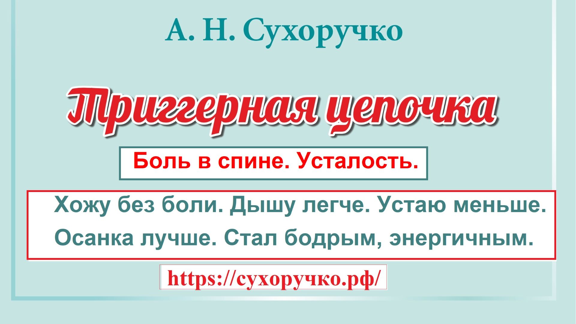 Триггерные цепочки/склеротомалгии сопровождаются общей усталостью, нарушением дыхания, депрессией. Сухоручко А.Н. «Тендомиотерапия» — это русская инновационная концепция оздоровления организма, без: неврологии, лекарств, МРТ, УЗИ, нейрохирургии, остеопатии, мануальной терапии, костоправства, тренажёров. Концепция состоит из методик «Статик Про», «Триггерная цепочка», «Тонус Ап!», «Атлант СТ», «Гармония слова». С помощью концепции устанавливается диагноз, определяется тактика оздоровления и профилактики; устраняются боли, головокружение, онемение; восстанавливается и укрепляется работа позвоночника, суставов; вертикализируется осанка; улучшается функция психической, сердечно-сосудистой, дыхательной, половой систем. Почувствуй легкость, энергию, силу — без мигрени, грыжи диска, остеохондроза, невралгий, артроза, сколиоза, панической атаки! Освободись от мифов неврологии, нейрохирургии, ортопедии, остеопатии; мануальной, висцеральной, кранио-сакральной, кинезиотерапий! Владей новой информацией и, будь здоров! Подробней читать в книге А.Н. Сухоручко "Триггерная цепочка. Энциклопедия здоровья позвоночника и суставов" / https://сухоручко.рф/