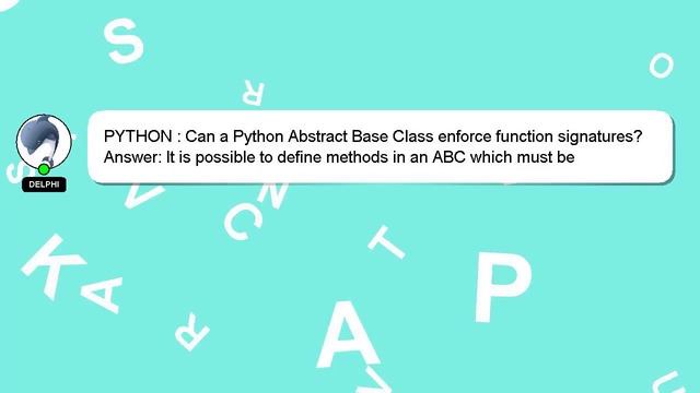 PYTHON : Can a Python Abstract Base Class enforce function signatures? To Access My Live Chat Page, On Google, Search for "hows tech developer connect" As I promised, I have a secret feature to share with you. This is a YouTube's feature which works on Desktop. First, Make sure the video is currently in playing mode. After that, type the word 'awesome' on your keyboard. Your YouTube progress bar will transform into a flashing rainbow. A short overview of who I am, Salutations, my name is Delphi. I help you answer your questions. PYTHON : Can a Python Abstract Base Class enforce function signatures? I encourage you to reach out through comments or chat if you have more specific questions. If you have an answer or any relevant information to share, please comment below. A 'heart' from me will indicate my appreciation for your answer. a function : Base Python Can signatures? Abstract Class PYTHON enforce