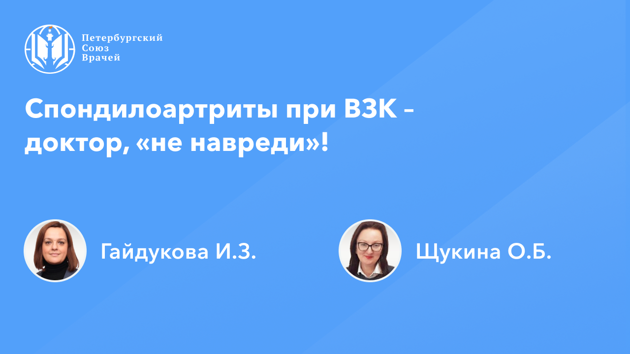 Спондилоартриты при ВЗК – доктор, «не навреди»!» Сайт: www.spb.doctor Дата проведения: 05.06.2023, 20:00 Страница мероприятия: https://spb.doctor/i/23060520/ Программа: Спондилоартриты при ВЗК – доктор, «не навреди»! 00:02:13 Гайдукова Инна Зурабиевна, 00:40:03 Щукина Оксана Борисовна 01:08:43 Трудности в лечении боли у пациентов с ВЗК и возможности их преодоления. Гайдукова Инна Зурабиевна 01:49:30 Ответы на вопросы О семинаре: Воспалительный процесс в суставах может развиваться вследствие воспалительных заболеваний кишечника (ВЗК). Спондилоартрит относится к наиболее частым суставным проявлениям ВЗК. В онлайн-семинаре эксперты расскажут какая связь между развитием спондилоартрита и ВЗК, случайно ли возникает такое сочетание, какая терапия показана пациентам при данном сочетании заболеваний и как обеспечить безопасность пациентов в условиях одновременного поражения опорно-двигательного аппарата и желудочно-кишечного тракта.