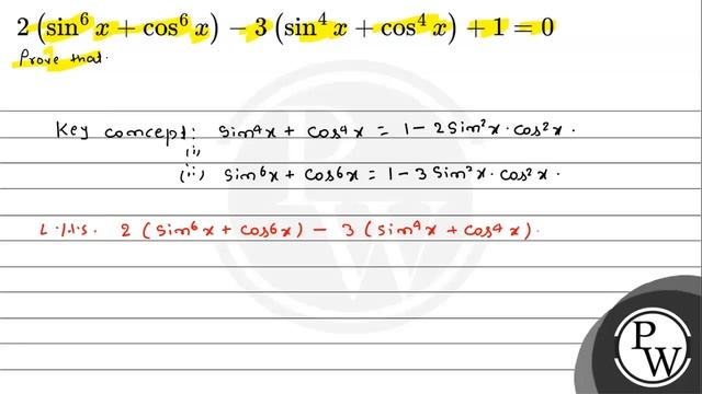 \( 2\left(\sin ^{6} x+\cos ^{6} x\right)-3\left(\sin ^{4} x+\cos ^{4} x\right)+1=0 \) 📲PW App Link - https://bit.ly/YTAI_PWAP 🌐PW Website - https://www.pw.live