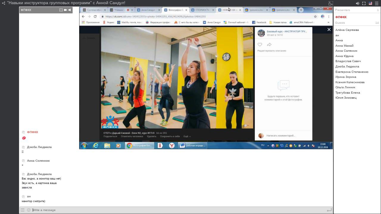 Он-лайн встреча на тему "Навыки инструктора групповых программ" с Анной Сандул! Навыки инструктора групповых программ - О чем? Для кого? Зачем?: общие понятия, понятие интенсивность, формирование инструкторских навыков, коммуникация, презентация и многое другое! Будь в курсе всех мероприятий Федерации Профессионалов Фитнеса Краснодарского края! Подписывайся на https://vk.com/app5728966_-51478454#2... и получай самые актуальные новости Наша группа в ВК https://vk.com/fpfkk РЕГИСТРАЦИЯ И ВОПРОСЫ 8(918)419-72-43 Анна Сандул 8(989)810-24-28 Ольга Алексеева