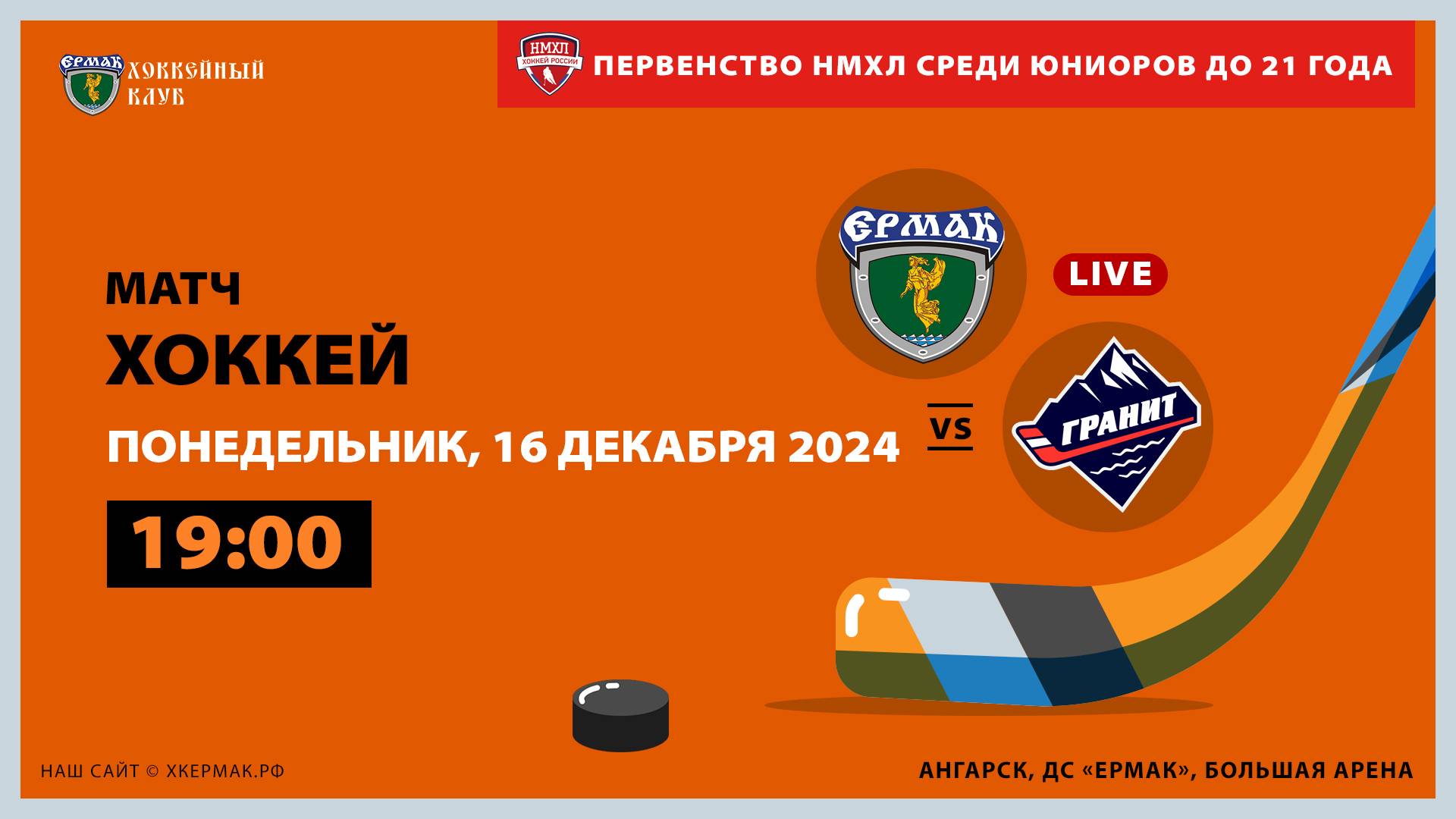 Матч между командами «Ермак» (Ангарск) и «Гранит» (Чехов) в рамках Первенства Национальной молодёжной лиги среди юниоров до 21 года. Конференция «Запад». Первый этап. Сезон 2024/25 годов. 16 декабря 2024 года. г. Ангарск, ДС «Ермак», большая арена