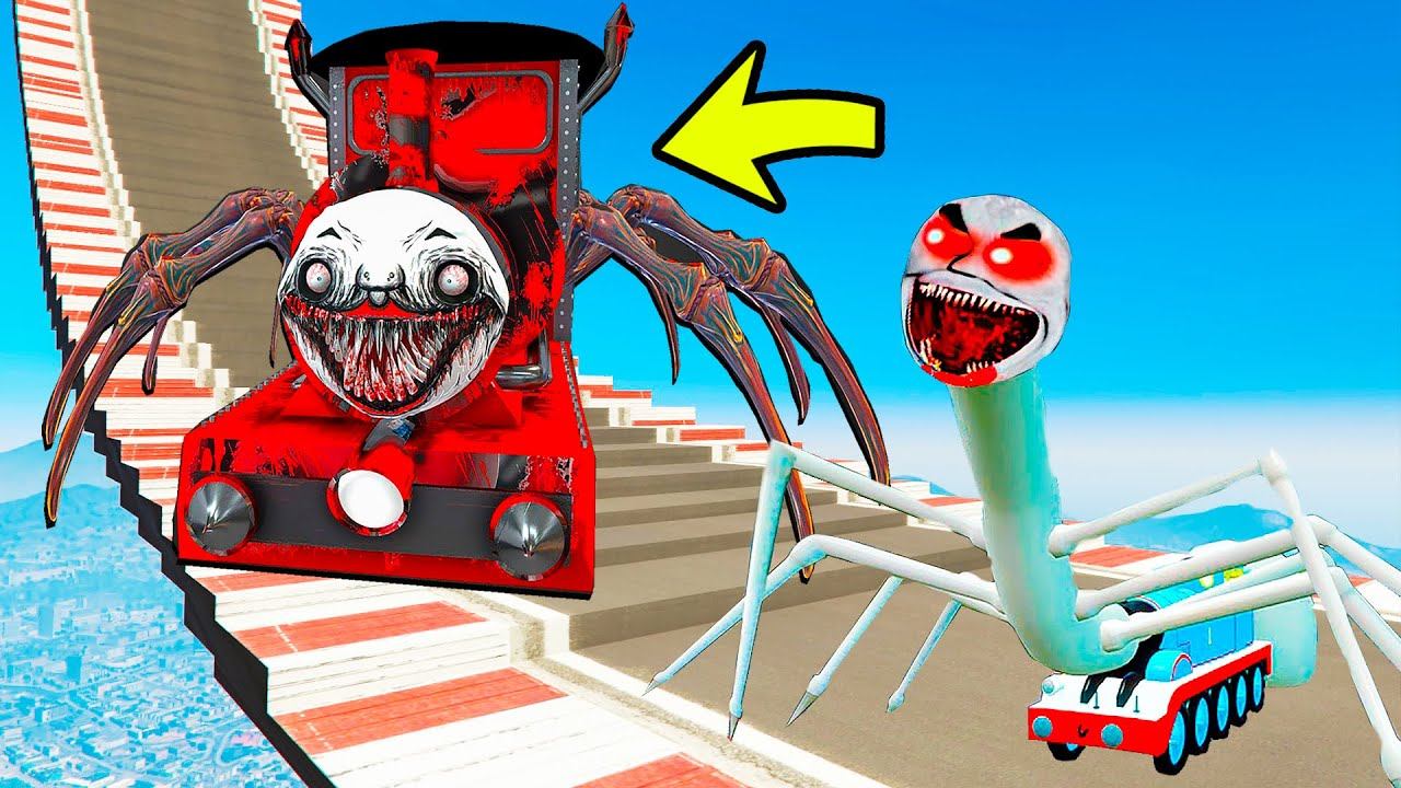 КАК ДАЛЕКО ПОЕЗД ПАУК ЧУ ЧУ И ДЕМОН ПАРОВОЗИК СМОГУТ ЗАБРАТЬСЯ ПО СТУПЕНЬКАМ ЛЕСТНИЦЫ В ГТА 5 МОДЫ!