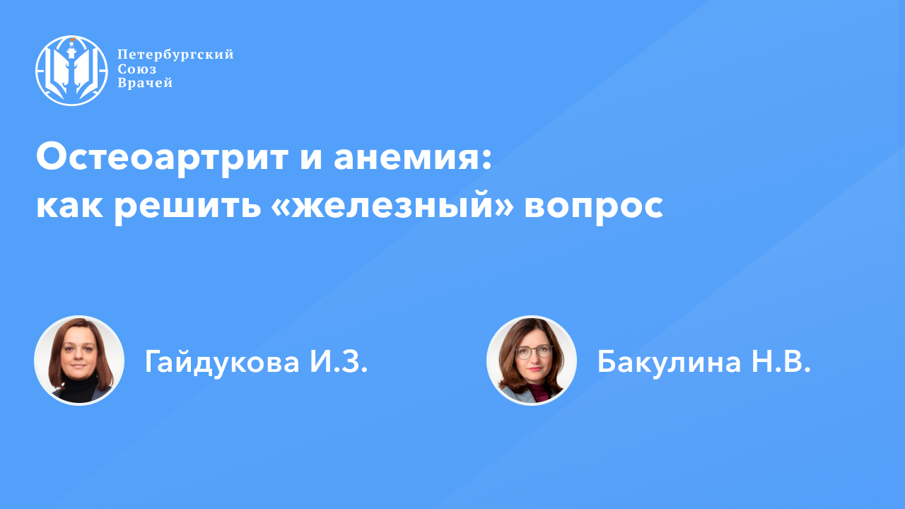 Остеоартрит и анемия: как решить «железный» вопрос Сайт: www.spb.doctor Дата проведения: 05.09.2023, 20:00 Страница мероприятия: https://spb.doctor/i/23090520/ Программа: 1. Остеоартрит и анемия: как решить «железный» вопрос. Гайдукова Инна Зурабиевна, Бакулина Наталья Валерьевна 2. Остеоартрит и анемия: семь способов уйти от проблем . Гайдукова Инна Зурабиевна, Бакулина Наталья Валерьевна 3. Ответы на вопросы О семинаре: Остеоартрит является одним из наиболее распространенных воспалительных заболеваний в структуре ревматологической патологии. Распространенность остеоартрита составляет 13-16% среди лиц старшей возрастной категории. Анемия является частой коморбидностью у больных остеоартритом. Лечение остеоартрита с применением НПВП может осложняться анемией вследствие поражения желудочно-кишечного тракта и почек. В онлайн-семинаре будут обсуждены алгоритмы дифференциальной диагностики анемий у пациентов с остеоартритом, вопросы влияния анемического синдрома на лечение остеоартрита, будут предложены решения, нацеливающие на междисциплинарное взаимодействие и последовательные шаги в повышении качества оказания медицинской помощи пациентам с остеоартритом и анемиями.