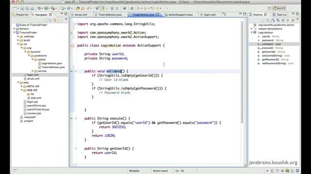 This video introduces the ActionSupport class and one of the features of the class, validation. We'll look at the validate() method and how we can implement simple form validations in Struts 2.