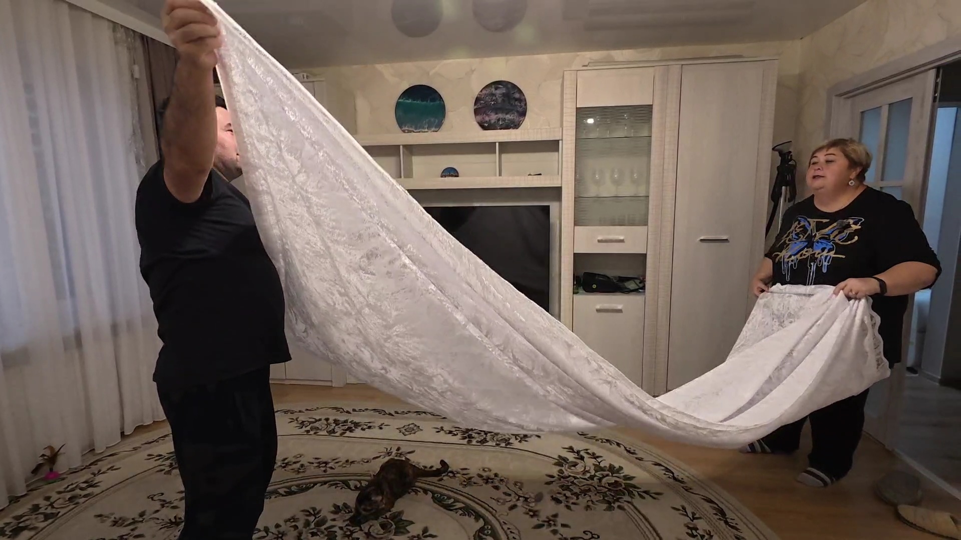 Готовлю бризоли. Абдугани вырезает тесто для творожных ушек. Постелили новый ковёр.