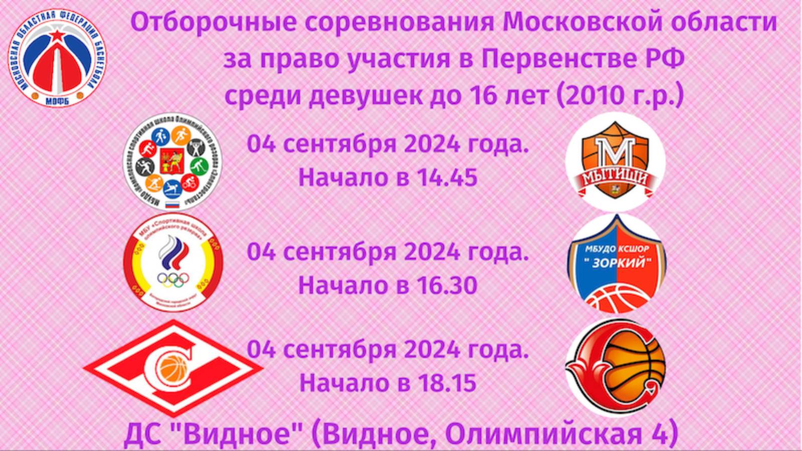 04 сентября 2024 года 14.45 Электросталь - Мытищи 16.30 Богородский – Красногорск 18.15 Люберцы - СШОР ИВС