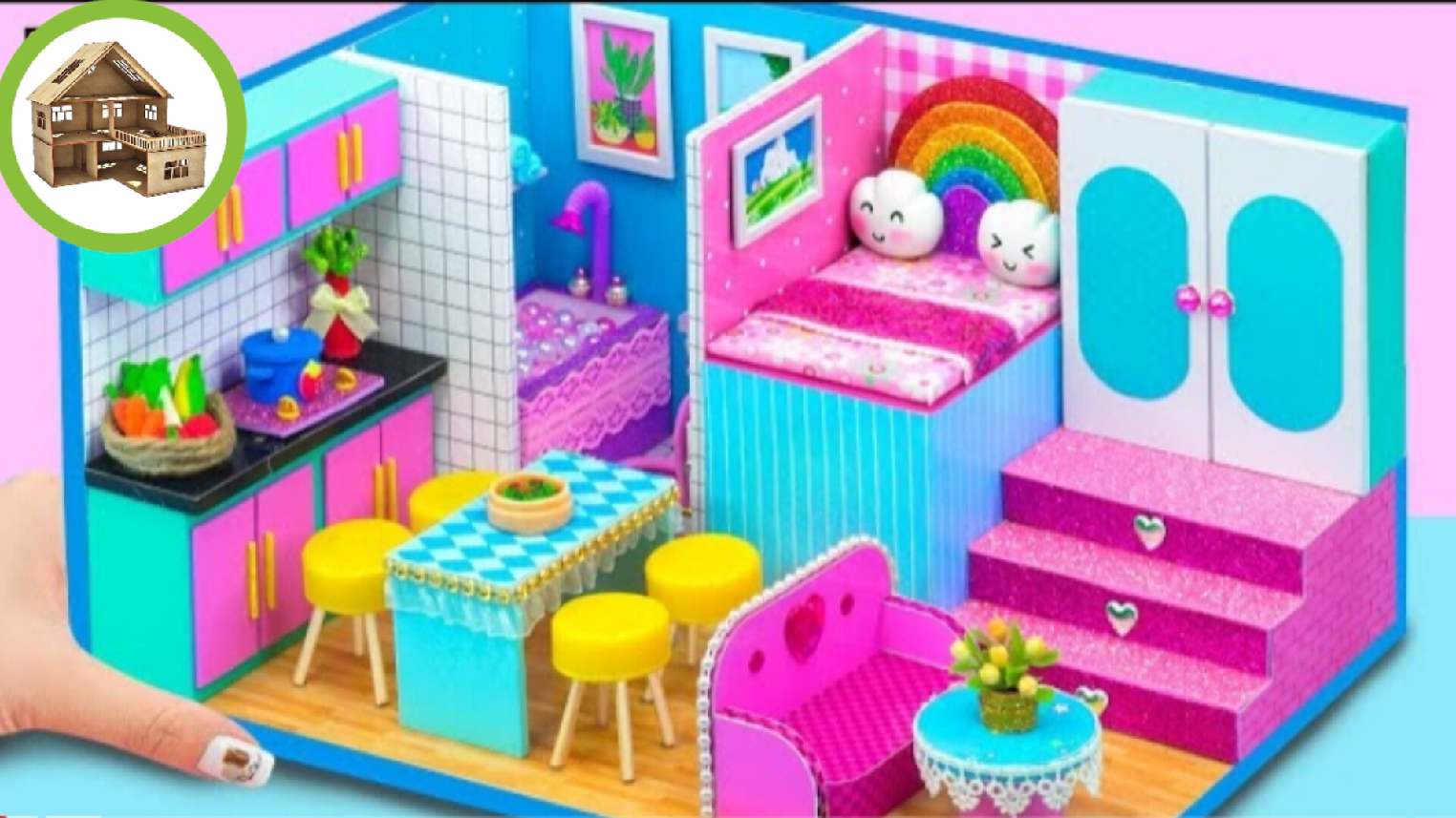 Розово синий миниатюрный домик с кухней и гостиной для двоих со всеми удобствами из картона /220