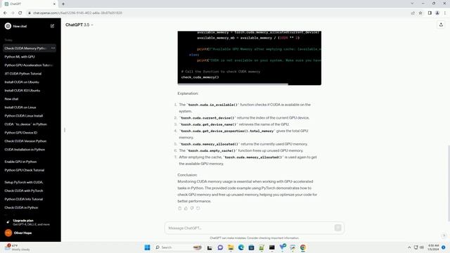 Download this code from https://codegive.com Title: A Guide to Checking CUDA Memory Usage in Python with Code Examples Introduction: CUDA (Compute Unified Device Architecture) is a parallel computing platform and application programming interface model created by Nvidia. It allows developers to harness the power of Nvidia GPUs (Graphics Processing Units) for general-purpose computing tasks. When working with CUDA in Python, it is crucial to monitor GPU memory usage to optimize performance and avoid memory-related issues. In this tutorial, we will explore how to check CUDA memory usage in Python using the PyTorch library as an example. Prerequisites: Code Example: Explanation: Conclusion: Monitoring CUDA memory usage is essential when working with GPU-accelerated tasks in Python. The provided code example using PyTorch demonstrates how to check GPU memory and free up unused memory, helping you optimize your code for better performance. ChatGPT