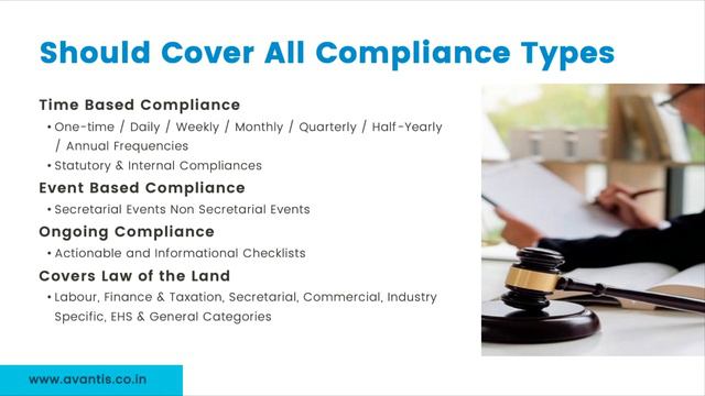 Compliance Management in India has largely been ad-hoc, paper based and people dependent. Compliance officers rely heavily on excel based tracking practices. However, as organizations become large, their compliance programs become complex. They are unable to create a transparent, accountable and timely compliance program using old techniques. They need a state of the art Compliance Management Software which can help them migrate to a smart, efficient and productive Compliance Program. However, choosing the right compliance software is not as simple as it sounds. Compliance in India is very complex and the software needs to satisfy a number of requirements before it becomes useful for your company. While software is supposed to make life easier, but too often it is a source of frustration. With a growing number of software products on the market, it has become increasingly difficult to select the right one without breaking the bank. How do you sort through all the choices and find the right software product and vendor for your business? Here are a few important considerations. In this webinar, Rishi Agrawal, CEO, Avantis Regtech, talks about various parameters that CXOs should consider before they buy a Compliance Management Software. Making a decision to buy and deploy a software has implications beyond the financial. There are other entry and exit costs. An organization commits a lot of intangibles such as executive time in decision making, deploying, training resources among others. In addition, there are implications on employee productivity, culture change and risk management practices. It is important to do thorough due diligence to ensure that the digital journey is smooth and you work with a vendor which has the right people, financial, technical and operational capabilities. A good selection can be a blessing and a bad one can put you and your organization behind by several years. Avantis RegTech, A TeamLease Company is India's leading Compliance Management Software Company. For free personalized, real time, national and comprehensive Legal Updates, visit www.avantis.co.in and subscribe to our newsletter. Call us at 8893594595 for more details, or write to us at sales@avantis.co.in to schedule a demo.