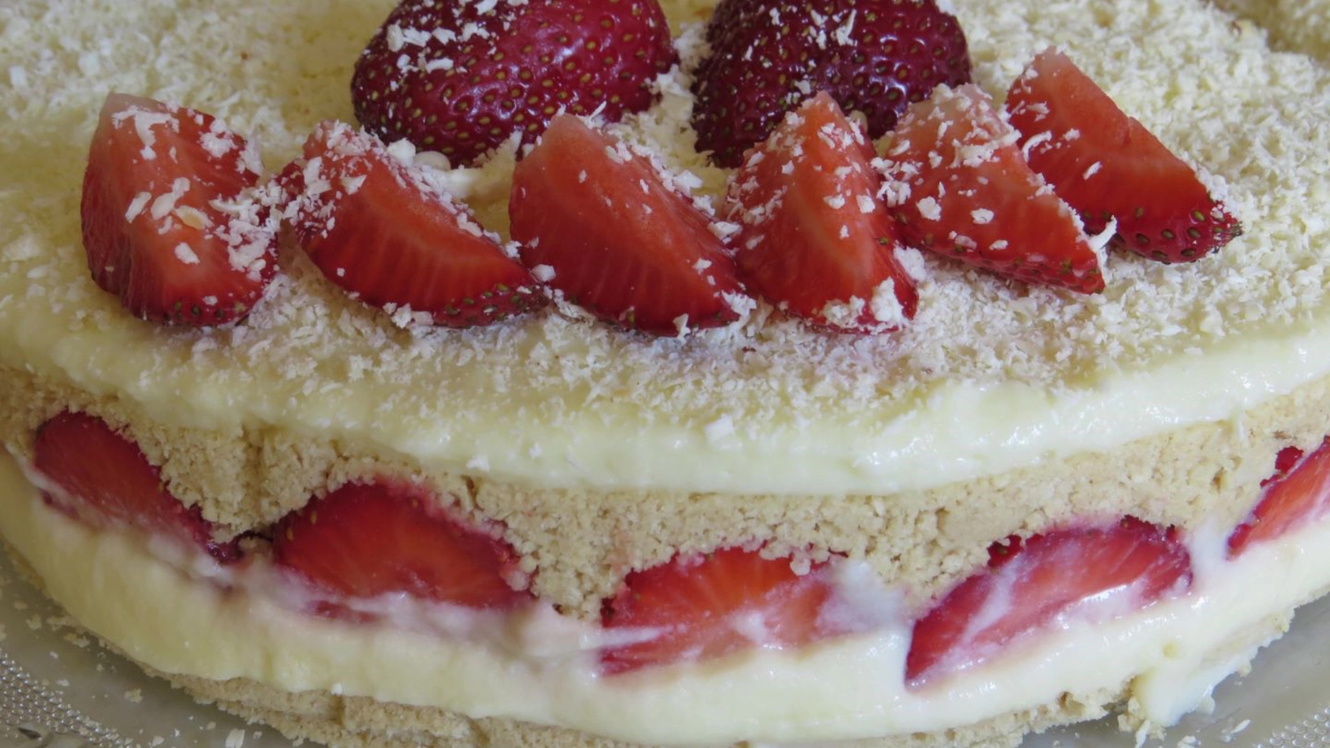 ЛЕТНИЙ Торт Клубничный ПЛОМБИР! БЕЗ ВЫПЕЧКИ. Изумительно Красивый и Простой Рецепт! Для коржей ЛУЧШЕ!!! использовать ВАФЕЛЬНЫЕ ГОТОВЫЕ коржи. Они не так крошатся при нарезке торта и застывает торт быстрее в холодильнике. Для крема Пломбир: Сметана - 500 гр Яйца - 2 шт Ванильный сахар - 1 ч л (8гр) Крахмал - 2 столовые с горкой Сгущенка - 100 гр Масло слив - 50 гр Коржи: Вафли - 600 гр (Лучше! Использовать вафельные готовые коржи!) Они не так крошатся при нарезке торта! И застывает торт быстрее! Клубника - 600 гр Шоколадка белая 100 гр