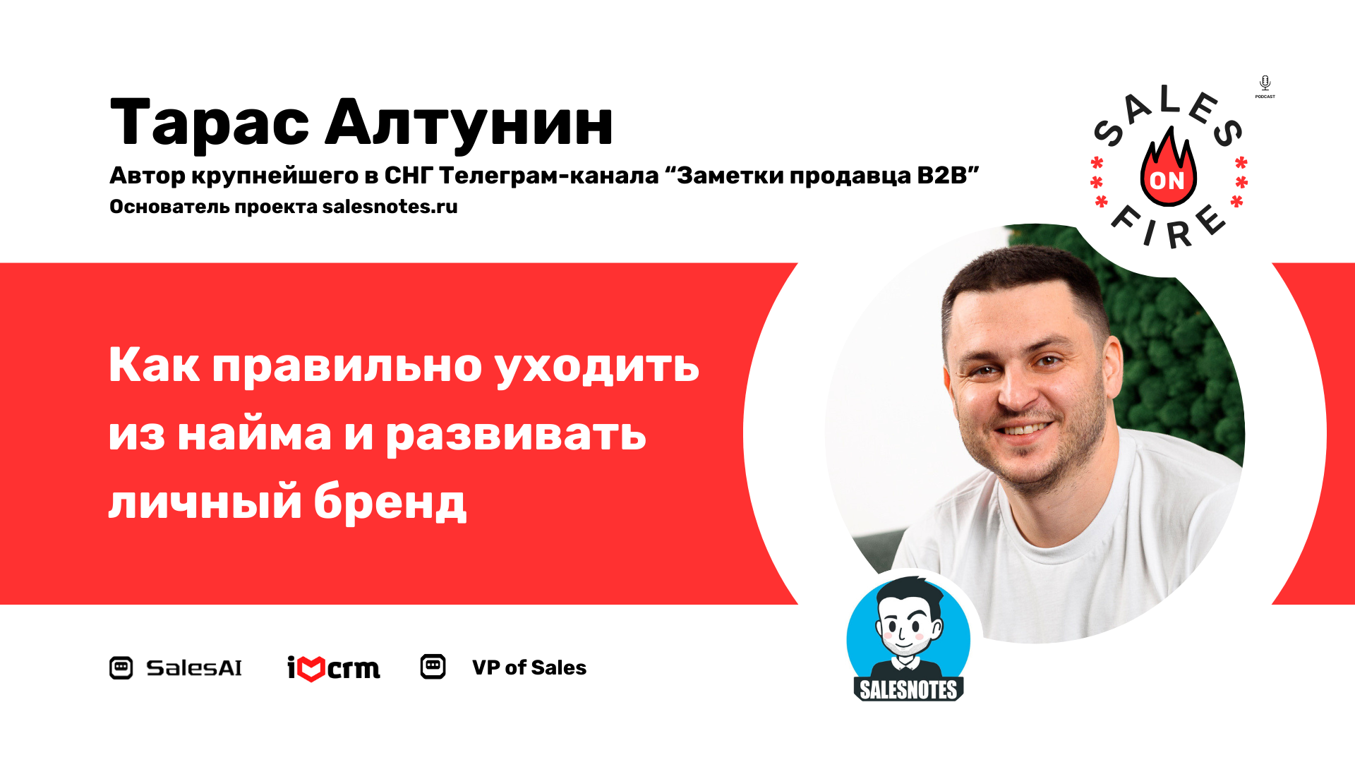 Как правильно уходить из найма и развивать личный бренд / Тарас Алтунин Тарас Алтунин умеет правильно выходить из найма Из этого выпуска вы узнаете о том, о чем наверняка уже много раз думали: как не выгорать на работе, что делать с холодными звонками и когда лучше всего выходить из найма. Выгорание на работе - бич нашего времени. В каждой компании от стартапа до энтерпрайз есть люди, которые уже выгорели и не знают, что с этим делать. У нас в студии пример хэппи энда такой истории. Редкого хэппиэнда. Тарас как Барон Мюнхгаузен смог вытащить себя из выгорания и сменил вектор от "по наклонной вниз" до роста вверх. А все почему? А все потому, что он умеет... Автор и основатель крупнейшего в СНГ telegram-канала по B2B продажам с аудиторией 13 500+ человек. “Заметки продавца B2B” https://bit.ly/3SALwZr Основатель проекта salesnotes.ru https://bit.ly/3FWwYvA Автор книги «360 ЗАМЕТОК ПРОДАВЦА B2B» https://bit.ly/3QCit58 Если вы посмотрите или послушаете этот выпуск подкаста, то узнаете про: 1. Какими каналами качать личный бренд: Выступления, Подкасты, Статьи, Linkedin, vc.ru, SEO сайта и тд 2. Когда ты работаешь в холодных продажах - ты сам выбираешь тех, с кем работать, а когда на входящих.... 3. Самый лучший момент выхода из найма это... 4. Почему люди выгорают на работе. 5. Не работайте с тем продуктом, который не драйвит! 6. Как найти драйв (и где его искать)? 7. Как определить нормального руководителя? 8. Как преодолеть страх перед держателем бюджета на новый софт? 9. Что делать, если тебе не нравятся холодные звонки, а звонить надо? 10. Как эффективнее искать исполнителей... и тд ---- Ведущие подкаста: Роман Магдаленко и Антон Борода. Партнеры выпуска: * SalesAI — Автоматическая квалификация лида, контроль качества звонков и заполнение CRM с помощью ИИ. https://salesai.ru * VP of Sales — Канал про Data Driven продажи. https://t.me/vpofsales * #IloveCRM — Все, что вы хотели знать про CRM, но стеснялись спросить. https://t.me/ilovecrm ---- #Podcast #Подкаст #ПродаживОгне #SalesOnFire #Sales #Marketing #Продажи #Маркетинг #b2b #лидерство