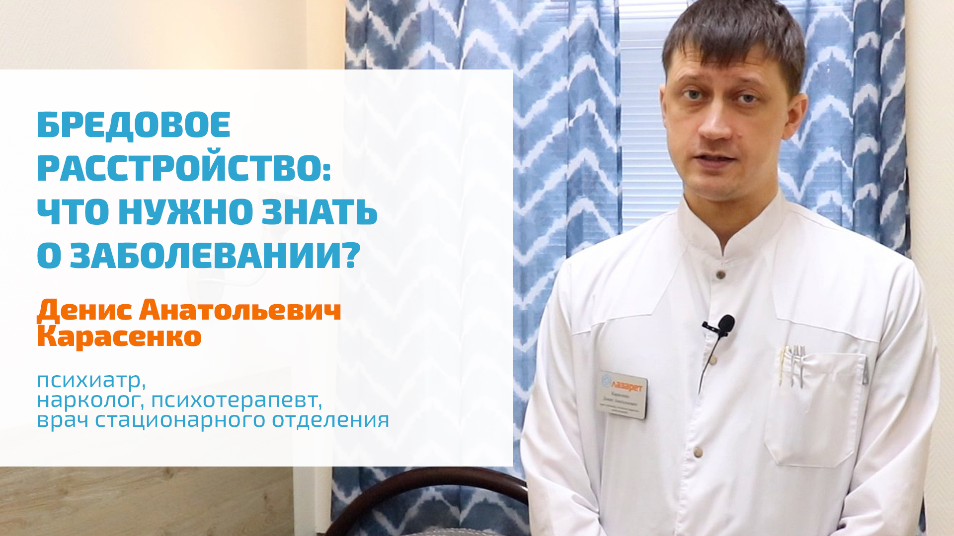 #ПСИХОЛОГИЯ #ПСИХИАТРИЯ #ЗДОРОВЬЕ https://lazaretspb.ru/psihiatriya/ Бредовое расстройство личности — редкое психическое заболевание. Симптомы и признаки бредового расстройства (например, при бреде ревности, бреде величия, бреде преследования) сводятся к хорошо систематизированной картине бреда, который может долго время не привлекать внимания даже самых близких людей. В период обострения заболевания необходима госпитализация в психиатрический стационар для подбора лечения, стабилизации состояния. В некоторых случаях возможно амбулаторное лечение бредового расстройства. 00:00 • Бредовое расстройство 00:15 • Симптомы хронического бредового расстройства 00:40 • Распространенность психопатологии бреда 01:02 • Виды бреда при заболевании 01:16 • Критерии диагноза бредового расстройства О бредовом расстройстве личности, симптомах и признаках, лечении в частном психиатрическом стационаре рассказывает Денис Анатольевич Карасенко, психиатр, психотерапевт, лечащий врач стационара клиники Лазарет. ? ЗАПИСЬ, КОНСУЛЬТАЦИЯ МЫ РАБОТАЕМ КРУГЛОСУТОЧНО, БЕЗ ВЫХОДНЫХ Если у Вас возникли вопросы о вариантах лечения психических расстройств и зависимостей, наши операторы ответят на них. Звоните — мы работаем круглосуточно, в том числе в выходные и праздничные дни. +7 (812) 604-33-30 8 (800) 300-64-39 ? ГОСПИТАЛИЗАЦИЯ В СТАЦИОНАР ИНОГОРОДНИМ, ЖИТЕЛЯМ БЛИЖНЕГО И ДАЛЬНЕГО ЗАРУБЕЖЬЯ Для иногородних, жителей ближнего и дальнего зарубежья, желающих пройти полноценное лечение в психиатрическом или наркологическом стационаре нашей клиники, возможна консультация по Skype, WhatsApp, Viber, Telegram. Напишите нам на адрес электронный почты, указав в письме контактную информацию, причину обращения, удобное для Вас время звонка. info@lazaretspb.ru ? КЛИНИКА ЛАЗАРЕТ — ОСОЗНАННЫЙ ВЫБОР ПСИХИАТРИЯ, ПСИХОТЕРАПИЯ, НАРКОЛОГИЯ И ПСИХОЛОГИЧЕСКАЯ ПОМОЩЬ Клиника Лазарет — одна из старейших клиник Санкт-Петербурга, специализирующаяся на помощи людям с легкими, пограничными и тяжелыми расстройствами психики, различными зависимостями. Также мы помогаем родственникам пациентов на всех этапах лечения — от мотивации к прохождению полноценного лечения, до ресоциализации — момента возвращения человека в общество и в семью, требующего специализированной психологической помощи и коррекции поведения. https://lazaretspb.ru https://vk.com/klinikalazaret