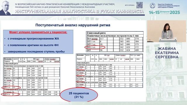 Лектор: Жабина Екатерина Сергеевна, к.м.н., старший научный сотрудник НИЛ электрокардиологии, ассистент кафедры факультетской терапии с клиникой ИМО ФГБУ «Национальный медицинский исследовательский центр имени В. А. Алмазова» МЗ РФ, Санкт-Петербург Усовершенствованный протокол автоматического анализа нагрузочной пробы - незаменимый помощник для правильной интерпретации аритмий.