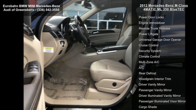 http://www.eurobahnm.com/search/tp//p/36953683?service=11 For Sale in Greensboro, NC 27409 Eurobahn BMW MINI Mercedes-Benz Audi of Greensboro (336) 542-3555 2012 Mercedes-Benz M-Class ML 350 BlueTEC Black Over tan Fully Loaded In excellent condition. This new ML is about an inch longer and a half-inch wider, and it squirts 0.8-inch lower than before. Cargo capacity behind the rear seat has grown seven cubic feet. The baseball bat of a turn-signal/wiper stalk thankfully has been moved to the 10-o'clock position on the steering column, and its cruise-control function has been relegated to a second stalk at 8 o'clock. Unfortunately, you'll still find yourself flicking at the column-mounted gear selector whenever you desire wipers. This Mercedes-Benz M-Class has a dependable Gas V6 3.5L/213 engine powering this Automatic transmission. Vehicle tool kit, Universal LATCH (lower anchors and tethers for children) system, Twin-gauge instrument cluster w/4.5" info display -in... read more at http://www.eurobahnm.com/search/tp//p/36953683?service=11