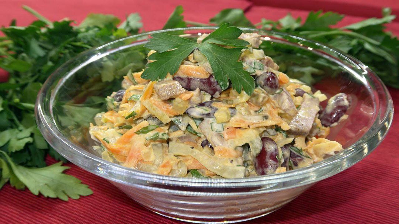 Очень вкусный мясной салат с красной фасолью. Салат на праздничный стол