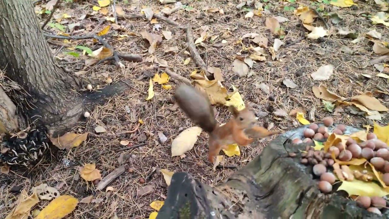 Белка прячет орехи у маленького пенька
