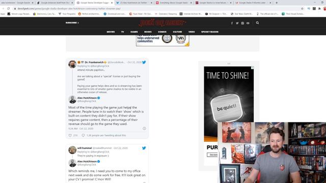 Alex Hutchinson, a developer and creative director for Google Stadia, just got destroyed on Twitter for his garbage take on streaming video games. Subscribe to my backup channel in case I'm gone soon! https://www.youtube.com/channel/UCAwWrYxKOhl6z94KEKpAYQA Become a channel member for cool perks and emotes! https://www.youtube.com/channel/UCP5gBSMw84NLljMLNqa09sQ/join Check out my twitch! https://www.twitch.tv/rkoutpost Check out my merch store! https://teespring.com/stores/rk-outpost Interested in becoming a patron? Thank you so much, check out the details here! https://www.patreon.com/rkoutpost A HUGE thank you to the following Patrons!: Master Level: Teresa Martin - https://www.youtube.com/channel/UCOtslVrAWs_pdhaqqkJ1iyw George BD Lucas/StoryMan - https://www.youtube.com/channel/UChizgbjrR4Oeos0VeHTtdzQ LostJedi22 - https://twitter.com/LostJedi22 Culture Casino - https://www.youtube.com/channel/UC74JI7VcEYGWKIFvS5TABNA Biggles Mets - https://www.twitch.tv/biggles_mets Open-Airlock Policy - https://www.youtube.com/channel/UCPNVYBj_UZoPQ2nJFbUoBLQ Joshua Sam - Hate Mongering Verbal Terrorist Of The Toxic Brood - https://twitter.com/ToxicBrood Knight Level: Mexican IronMan - https://twitter.com/MikeCanulSJ?s=20 Neo Valentine - https://twitter.com/NeoValentine Anne D Larkin Trace XL - https://twitter.com/Trace_XL The Geek Blend - https://www.youtube.com/channel/UCd8ZAyrFETCWQpVY2sNRXZg Daniel Hymes - https://www.twitch.tv/lavenderrock253 Mike Jackson - DarkSideDroids - https://www.twitch.tv/darksidedroids Padawan Level: WhatAnAssWhatABitchWhatACuck - https://www.youtube.com/channel/UCXGCrVFbtF2jaW-lNLWPleg Rosetta Allen - https://www.youtube.com/channel/UCTFYN9gQMmUmQWS3CGaQGsw Bionic Bellybutton - https://twitter.com/BionicBButton?s=20 RC From The NYC - https://www.instagram.com/cruzfucius/?hl=en Riff Magos - https://www.youtube.com/user/riffmagos ThiccKaren - https://twitter.com/ThiccKaren2020 AFK Bard - https://www.youtube.com/user/w07v3r3dux R R- MyNerdyHome - https://www.youtube.com/user/stephcalzone Lethal Lightning - https://www.youtube.com/channel/UCHfjRszUj0JLKZFlKbABITg Raging Ryno - https://www.youtube.com/channel/UChA1ecX1E6m2mj9kNu-s83g Optimus Prune - Douglas Almon - https://twitter.com/DouglasAlmon Ally-C Geeky Pixie - https://www.youtube.com/channel/UCJ0PUOfgYRdimx8SWELETeg Want to send me something? That's awesome! Ryan Kinel - RK Outpost PO Box 211376 Chula Vista, CA 91921 Get RK outpost tanks and tees here: https://www.teamshopsaga.com/rkoutpost Come join my awesome community on Discord: https://discord.gg/NsEdeqP For some awesome geek and nerd shaker cups and fitness accessories check out PERFORMA!: http://www.performa.com?aff=103 Use code KINEL15 for 15% off! Check out and subscribe to these other channels that I'm a part of! Geeks and Gamers: https://www.youtube.com/channel/UCMvVQIAfsGwzrfPLxiaIG8g Sports Wars: https://www.youtube.com/channel/UCGcW1IvvBzwUgOPNQsbUSSQ Gaming with Geeks: https://www.youtube.com/channel/UCsXv5AagFpkiS-W0m_5rxjQ Check out my Twitter: https://twitter.com/KinelRyan Check out my Instagram: https://www.instagram.com/ryan_kinel/ #Google #Stadia #AlexHutchinson