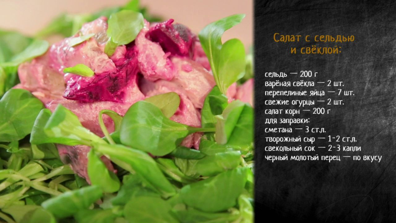 Ингредиенты: Сельдь — 200 г Вареная свекла — 2 шт. Перепелиные яйца — 7 шт. Свежие огурцы — 2 шт. Салат корн — 200 г Для заправки: Сметана — 3 ст.л. Творожный сыр — 1-2 ст.л. Свекольный сок — 2-3 капли Черный молотый перец — по вкусу Приготовление: Сельдь порежьте кусочками на один укус, огурцы очистите от кожуры и порубите брусочками. Такими же по размеру ломтиками порежьте вареную свеклу. Перепелиные яйца разрежьте пополам. Для соуса смешайте сметану, творожный сыр и пару капель свекольного сока. Заправьте салат и подавайте его на подушке из листьев корна.