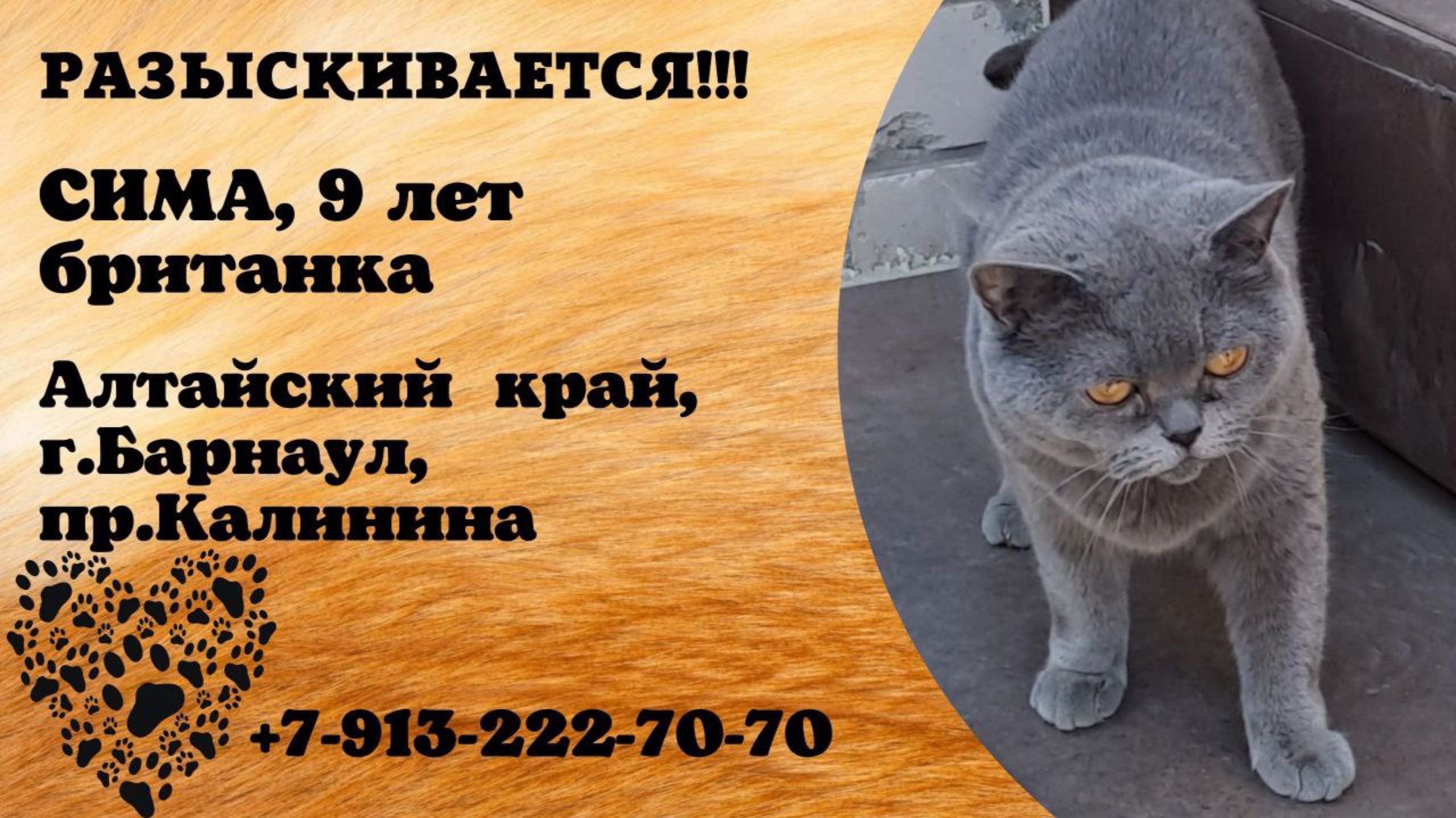 Пропал кот! СИМА, 9 лет, британка. Алтайский край, г.Барнаул.