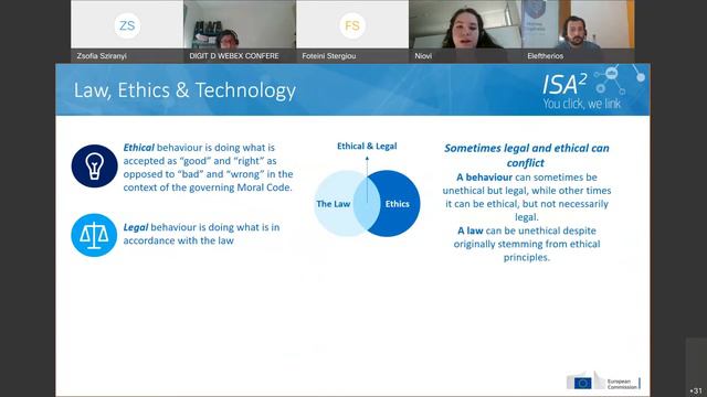 June Virtual Breakfast | A brave new world: Digital-ready lawmaking & ethics As part of its June edition, the European Commission LIOP team organised a virtual breakfast on digital-ready lawmaking and ethics, where participants and speakers from civil society, businesses, public administration, as well as researchers and academics explored the ethical implications of digital-ready policies, law and technology. Speakers: Jan De Bruyne, Research expert in AI & Law - KU Leuven, Senior researcher at the Knowledge Centre Data & Society Mireille Hildebrandt, Head of Project at COHUBICOL, Research Professor - Law, Science, Technology & Society (LSTS) Research Group, VUB Laurence Diver, Postdoctoral and Senior legal researcher at COHUBICOL, LSTS Research Group, VUB Jelle Hoedemaekers, Expert in ICT Standardisation, Agorija Eleftherios Chelioudakis, Co-founder of Homo Digitalis, Lawyer specialised in Law & New Technologies