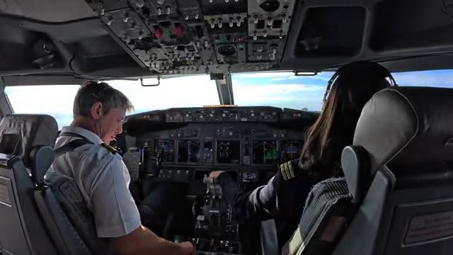 Красивая женщина пилот сажает свой самолёт Boeing 737-800