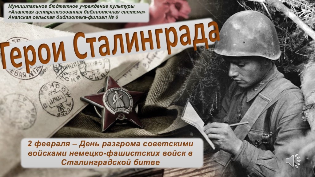 Сталинград! Крепость на Волге. Город-легенда. Город-герой. Здесь люди стояли как скалы. Здесь жизнь победила смерть. С. Алексеев 80 лет со дня разгрома советскими войсками немецко-фашистских войск в Сталинградской битве. 2 февраля – День разгрома советскими войсками немецко-фашистских войск в Сталинградской битве (1943 год). Установлен Федеральным законом № 32-ФЗ от 13 марта 1995 года «О днях воинской славы (победных днях) России». Есть в календаре такие даты, которые навечно вписаны в героическую летопись страны. Одна из них – Сталинградская битва. Она стала переломным моментом в военном противостоянии нацизму, оказала большое влияние на дальнейший ход войны, заложив прочную основу для полного разгрома нацистской Германии. Подготовлено главным библиотекарем Анапской сельской библиотеки- филиала №. 6 И.В. Порываевой