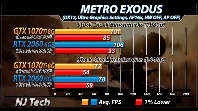 GTX 1070 Ti Vs. RTX 2060 | 1080p and 1440p | 28 Games Benchmarks In this Video I'll Show You Gaming Benchmarks of Nvidia GTX 1070 Ti Vs. Nvidia RTX 2060 (Both Paired with Core i9-10900K) System Specs : intel Core i9-10900K Gigabyte Z490 Auros Master 2*8GB DDR4 CL16 RAM @ 3200MHz Zotac GTX 1070 Ti NvidiaRTX 2060 FE (GeForce Graphic driver 456.55) 1080p and 1440p Gaming Test : Mafia Definitive Edition Microsoft Flight Simulator Horizon Zero Dawn Death Stranding F1 2020 Predator: Hunting Grounds Resident Evil 2: Remake DOOM Eternal Call of Duty : Warzone Destiny 2 : Season of Arrivals Star Wars Jedi : Faller Order Detroit: Become Human Need For Speed: Heat Red Dead Redemption 2 Ghost Recon Breakpoint Gears 5 Wolfenstein Youngblood The Division 2 Apex Legends Metro Exodus Battlefield 5 Assassin's Creed Odyssey Forza Horizon 4 Shadow of Tomb Raider Fortnite: Chapter 2 PUBG Rainbow Six Siege Also Watch- GTX 16 Series Gaming Benchmarks/Comparison - https://goo.gl/jDMyZX Radfeon 7 Gaming Benchmarks/Comparison - https://goo.gl/4LhUFZ RTX 20 Series Gaming Benchmarks/Comparison - https://goo.gl/MHfdBq Core i5-8400 Benchmarks/Comparison Playlist - https://goo.gl/kjuFhB Core i3-8350K Overclocked Benchmarks/Comparison Playlist - https://goo.gl/LXxpdo GTX 1070 Ti Benchmarks/Comparison Playlist - https://goo.gl/rmLg9T Ryzen 1200 Benchmarks/Comparison Playlist - https://goo.gl/g3BFXj Coffee Lake CPU Benchmarks/Comparison Playlist - https://goo.gl/4nY8vm Core i3-8100 Benchmarks/Comparison Playlist - https://goo.gl/mdJ6Ub GT 1030 Benchmarks/Comparison Playlist - https://goo.gl/PgPZJY ALL Benchmarks/Comparison Playlist - https://goo.gl/njtyMF Requested Benchmarks/Comparison Playlist - https://goo.gl/4idZne if You Requested any Benchmarks or Comparison before... Please Check Requested Benchmarks Playlist - https://goo.gl/4idZne Thanks For Support and Watching My Video... Please Subscribe my Channel For More updates News.... Twitter - twitter.com/njtech0 facebook - fb.me/njtech0 Email - njtech52@gmail.com Background Music : Ascence - Konnichiwa [NCS Release] Intro:Nishanth Kundar Elegant logo #NJTech #GTX1070Ti #RTX2060