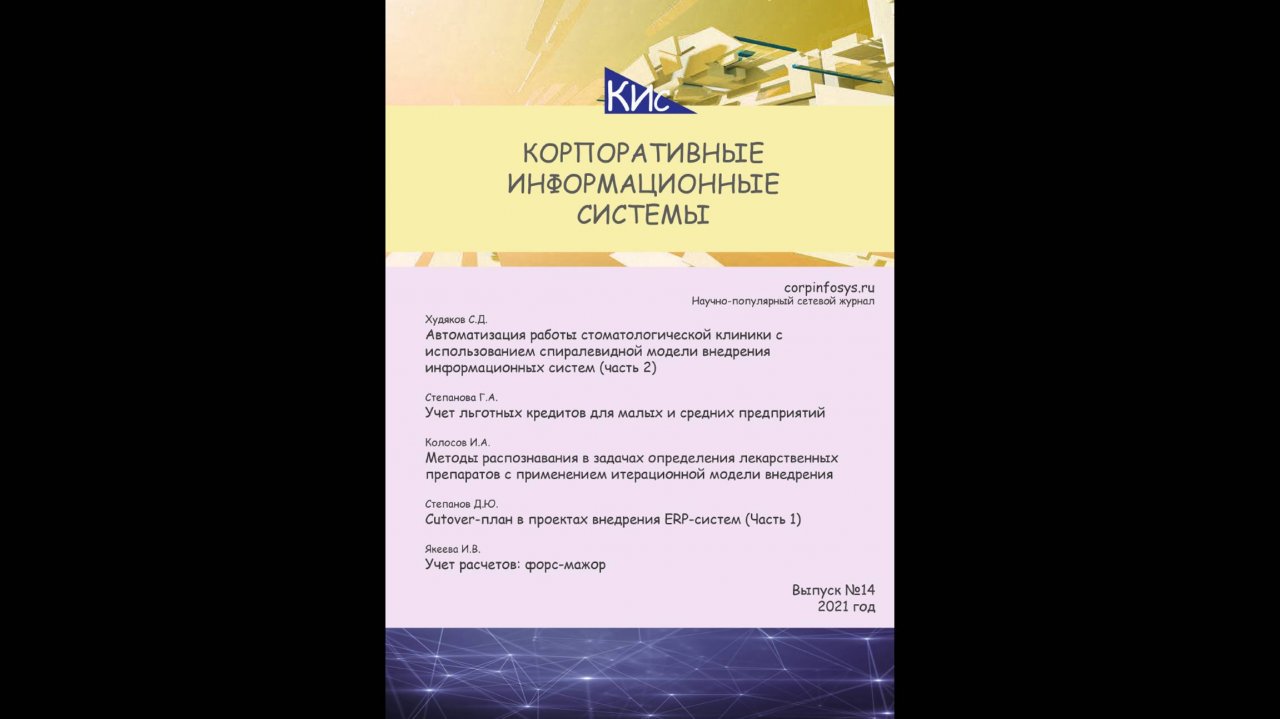 Ссылка: https://corpinfosys.ru/archive/2021/issue-14. Выпуск №14 за 2-й квартал 2021 года содержит подборку научно-популярных статей, касающихся автоматизации работы стоматологической клиники с использованием спиралевидной модели внедрения информационных систем, учета льготных кредитов для малых и средних предприятий, методов распознавания в задачах определения лекарственных препаратов, Cutover-плана в проектах внедрения ERP-систем, форс-мажоров в учете расчетов. Номер включает следующие статьи: - Автоматизация работы стоматологической клиники (часть 2); - Учет льготных кредитов для малых и средних предприятий; - Методы распознавания для подбора лекарственных препаратов; - Cutover-план в проектах внедрения ERP-систем (часть 1); - Учет расчетов: форс-мажор. Материалы были подготовлены коллективом авторов: Колосов И.А., Степанова Г.А., Степанов Д.Ю., Худяков С.Д. и Якеева И.В.