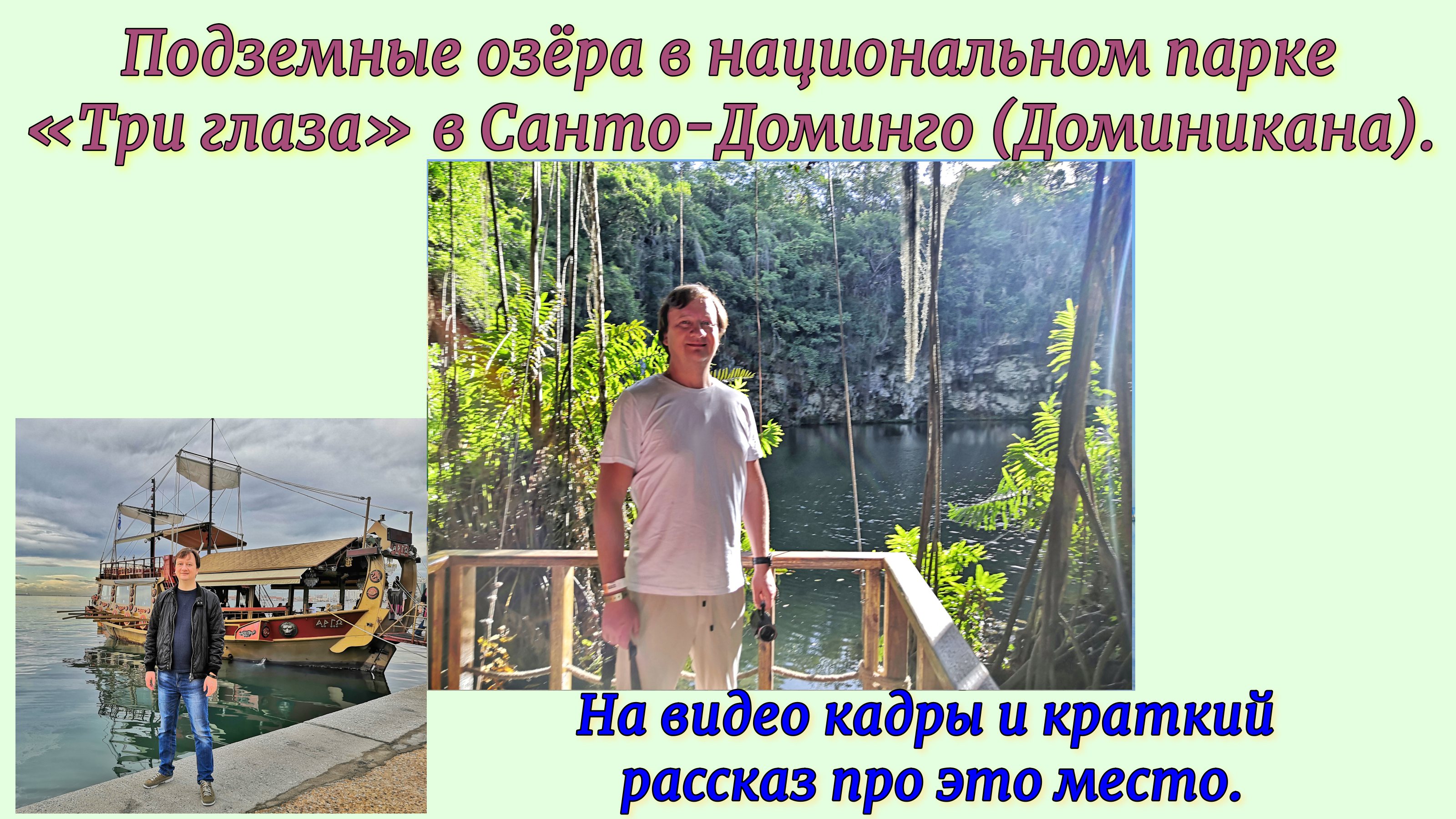 Одной из главных достопримечательностей Санто-Доминго, а это, кто не знал, столица Доминиканской Республики, является национальный парк «Три глаза» с его знаменитыми подземными озёрами. Эти три озера и есть три глаза в честь которых и назван парк. Все озёра находятся под землёй, и все отличаются друг от друга. Немного расскажу в этом видео про своё посещение сегодня этого места. Кстати, а озёр то оказалось четыре! Мне это место понравилось. Не то чтобы прям «Ах»! Но съездить стоит. * Подробнее об этом смотрите в видео. Приятного просмотра! Это видео и другие публикации на моём канале в яндекс.дзен, «Про путешествия. Иван Матрёнин». Адрес в Дзене - https://zen.yandex.ru/travelblogger. Подписывайтесь на мой канал! Ссылка на это видео – https://zen.yandex.ru/video/watch/61bfb98ca2de17238a61c953 * На моём канале в YouTube - ищите Travel blogger Ivan Matrenin. Ссылка на это видео - https://youtu.be/ulUWhYOQEkQ Ссылка на это видео в Rutube – https://home.strannik-j.org/video/a0ff847c6739444dfb8ee357fd793afb/