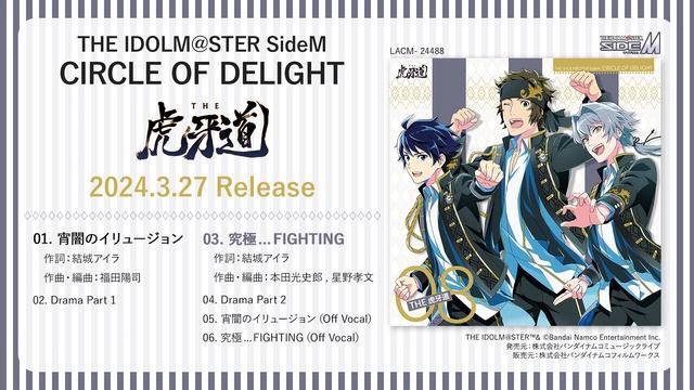 2024.3.27 RELEASE★★★ THE IDOLM@STER SideM CIRCLE OF DELIGHT 08 THE 虎牙道 💿CD SHOP:https://lnk.to/LACM.24488 📖連動ストーリー: https://asobistory.asobistore.jp/connectwithmusic/detail/lvk2yk0155pqg10/ THE 虎牙道 [大河タケル(CV.寺島惇太), 円城寺道流(CV.濱野大輝), 牙崎 漣(CV.小松昌平)] 価格:2,090円(10%税込) / 1,900円(税抜) 品番:LACM-24488 発売元:株式会社バンダイナムコミュージックライブ 販売元:株式会社バンダイナムコフィルムワークス INDEX★★★ 01. 宵闇のイリュージョン 作詞:結城アイラ 作曲・編曲:福田陽司 02. Drama part 1 03. 究極…FIGHTING 作詞:結城アイラ 作曲・編曲:本田光史郎, 星野孝文 04. Drama part 2 05. 宵闇のイリュージョン(Off Vocal) 06. 究極…FIGHTING(Off Vocal) ご購入はコチラから★★★ https://lnk.to/LACM.24488 THE IDOLM@STER™& ©Bandai Namco Entertainment Inc. #SideM #THE虎牙道 #idolmaster #アイマス