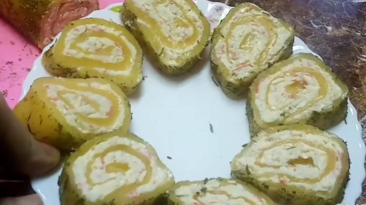 Закуска на праздничный стол "Сырный ролл с начинкой из крабовых палочек и плавленного сыра"