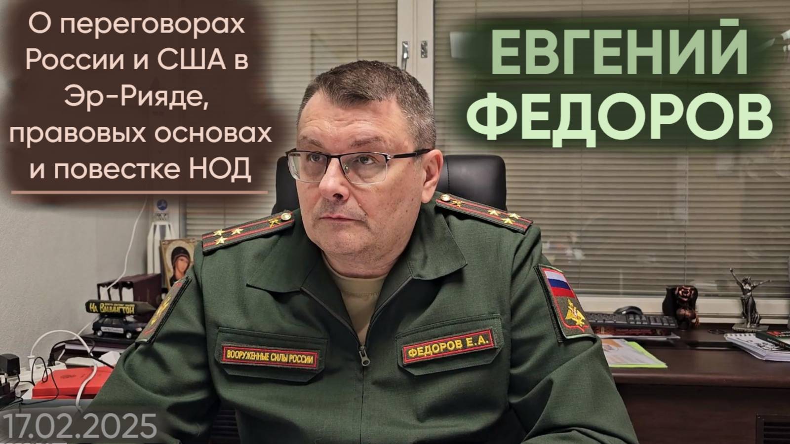 Депутат Государственной думы ФС РФ и координатор Национально-освободительного движения Евгений Федоров о переговорах России и США в Эр-Рияде, независимости Украины, международном праве, целях США и однополяном мире. Таймкоды видео: 00:00 О переговорах России и США в Эр-Рияде и повестке НОД. 04:24 Невозможно договориться без правовой основы. Независимость Украины. Вопрос суверенитета. 07:40 Необходимость определения правового статуса Украины в суде в соответствии с международным правом. Америка поменяла позицию. Патриотизм через испытания. 12:06 Компании «BlackRock» и «Vanguard» скупают территории Украины? Обманный прием Трампа. 17:36 Будут ли переговоры долгими и затяжными? Параллельность военных процессов и переговоров. 19:30 Задачи США. Желания двух сторон на переговорах. Огонь, вода и медные трубы. 24:38 В СССР ракеты и суверенитет не спасли от проигрыша. Почему? Кто сейчас предлагает план победы в России? 29:20 Возможна ли смена власти в Европе? Вассалы США и однополярный мир. Распределение функций управления и карательных операций. 33:07 С кем нужно разговаривать? О правовом подходе. Видео от 17.02.2025 Подписывайтесь на социальные сети Евгения Федорова: ВКонтакте: https://vk.com/efedorov_club Дзен: https://dzen.ru/fedorovgd Telegram: https://t.me/fedorovgd Одноклассники: https://ok.ru/fedorovyev