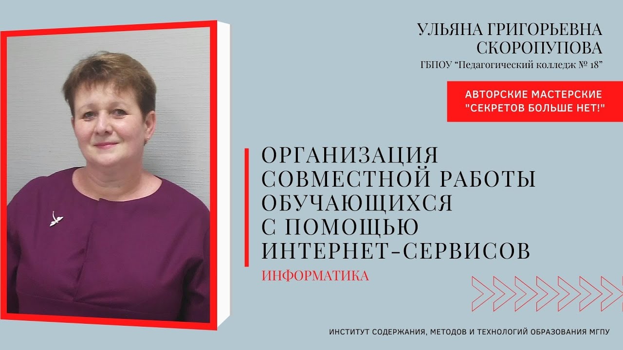 Ведущая мастерской: Скоропупова Ульяна Григорьевна, ГБПОУ “Педагогический колледж № 18” Тема: "Организация совместной работы обучающихся с помощью интернет-сервисов"