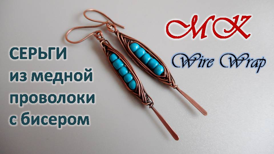 СЕРЬГИ из медной проволоки с бисером под бирюзу Wire Wrap