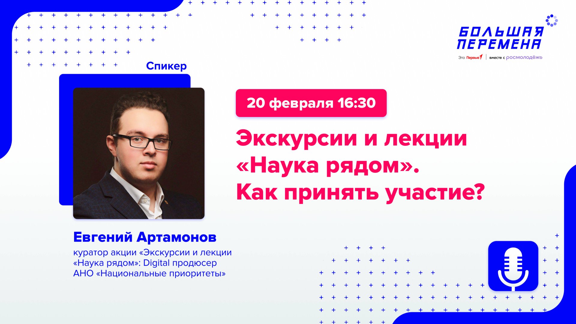 👍Экскурсии и лекции «Наука рядом»! 💻Так называется акция АНО «Национальные приоритеты», приуроченная к Десятилетию науки и технологий в России. В её рамках каждый желающий может отправиться на бесплатные экскурсии по научным и технологическим объектам, посетить лекции российских учёных. 📌Как это сделать? Подробно объясним в прямом эфире 20 февраля, в 16:30. В этот день «Учительскую» посетит куратор акции, Digital продюсер АНО «Национальные приоритеты» Евгений Артамонов. Он ответит на все ваши вопросы по заявленной теме. Ждём всех на нашем стриме и на экскурсиях в рамках акции! Также делимся с вами 💡 презентацией с общей информацией о Десятилетии науки и технологий в России и акции «Экскурсии и лекции "Наука рядом"», 💡 расписанием экскурсий на март 🔗 Следить за расписанием экскурсий на следующие месяцы можно на официальном сайте акции по ссылке: vk.cc/cIMTyr. 📍 Если в расписании нет вашего региона, но у вас есть заинтересованная в посещении подобного мероприятия группа детей, мы можем передать организаторам акции ваш запрос на проведение экскурсии или лекции. ✉ Сообщите в комментариях ваш регион, название вашей организации и интересующий вас формат мероприятия (лекция или экскурсия, примерные тематики или научные и технологические объекты, которые хотели бы посетить). #УчительскаяБольшойПеремены