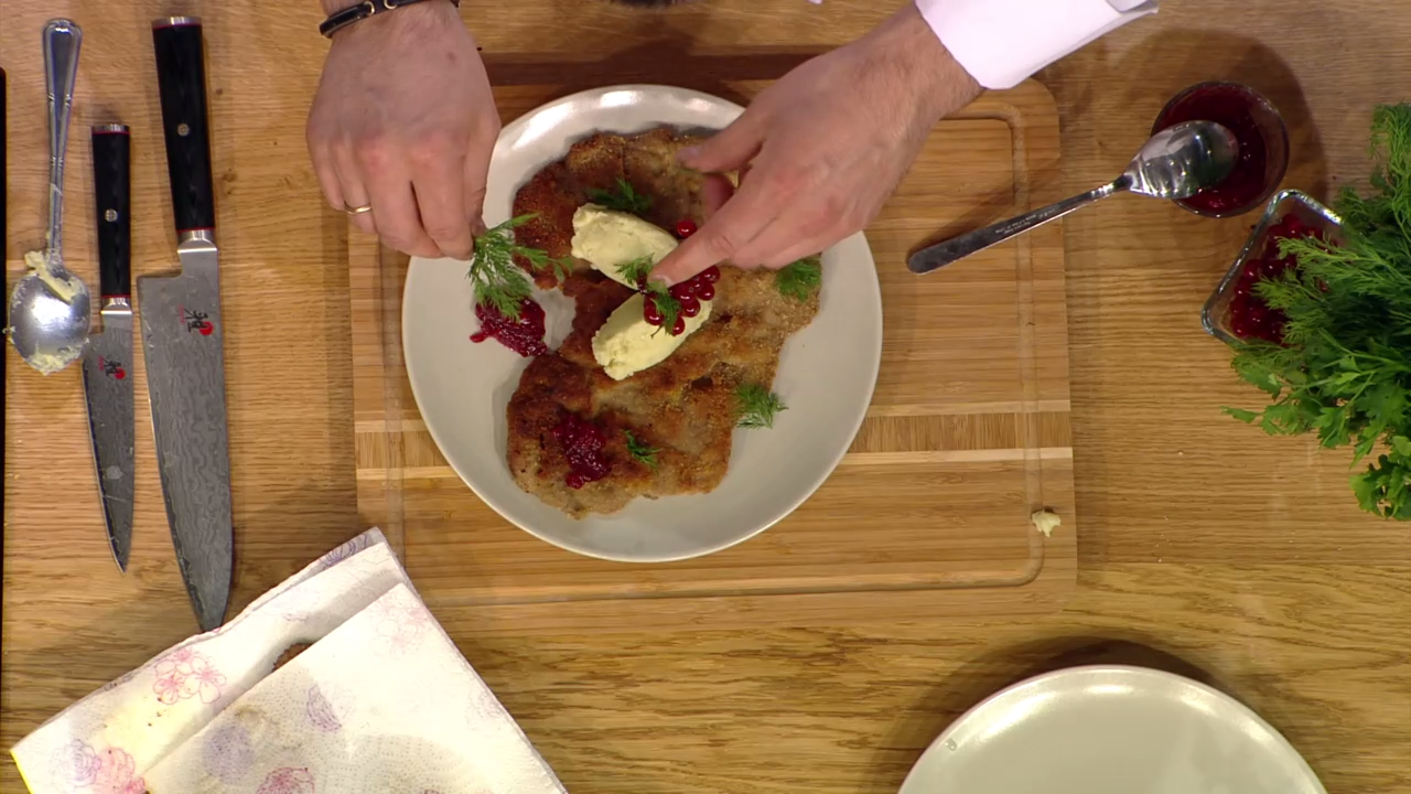 Шницель по-венски. Ржаной хлеб с грудинкой